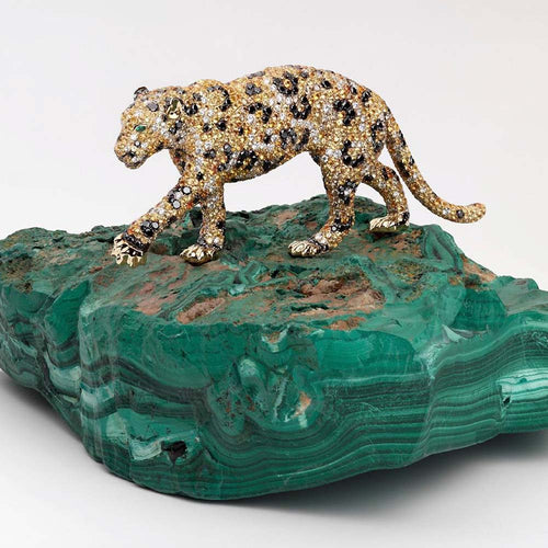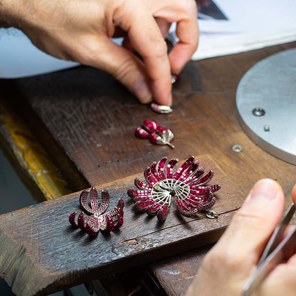 KS:我们第一个有影响力的作品是使用我们标志性的隐形镶嵌。那是一组鹦鹉胸针和物品,用沙弗莱石、红宝石、蓝色和橙色蓝宝石镶嵌,灵感来自我在亚马逊河的旅行。为了再现鸟类的羽毛,每根羽毛都必须单一地连接到中央的黄金结构上,并用长针固定,以确保三维的效果。无数人前来观看这些鹦鹉在展览上的展示,因此我们决定发展这个系列,并在每一个即将到来的展览中展示一些重要的独特作品。其中之一--最近的 菊花项链 ,来自The Noble Ones系列--标志着另一个关键时刻,因为我们进入了更多的雕塑珠宝。这件作品的工艺复杂程度令人咋舌,无论是其三维效果还是宝石的镶嵌都是如此。如果你仔细看一下花瓣,你会发现红宝石甚至点缀了那些不显眼的部分。