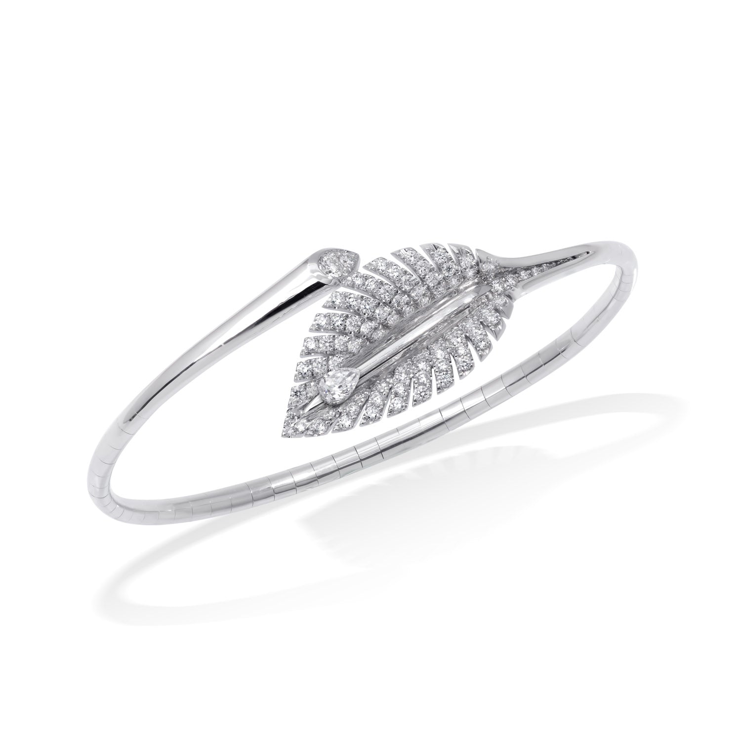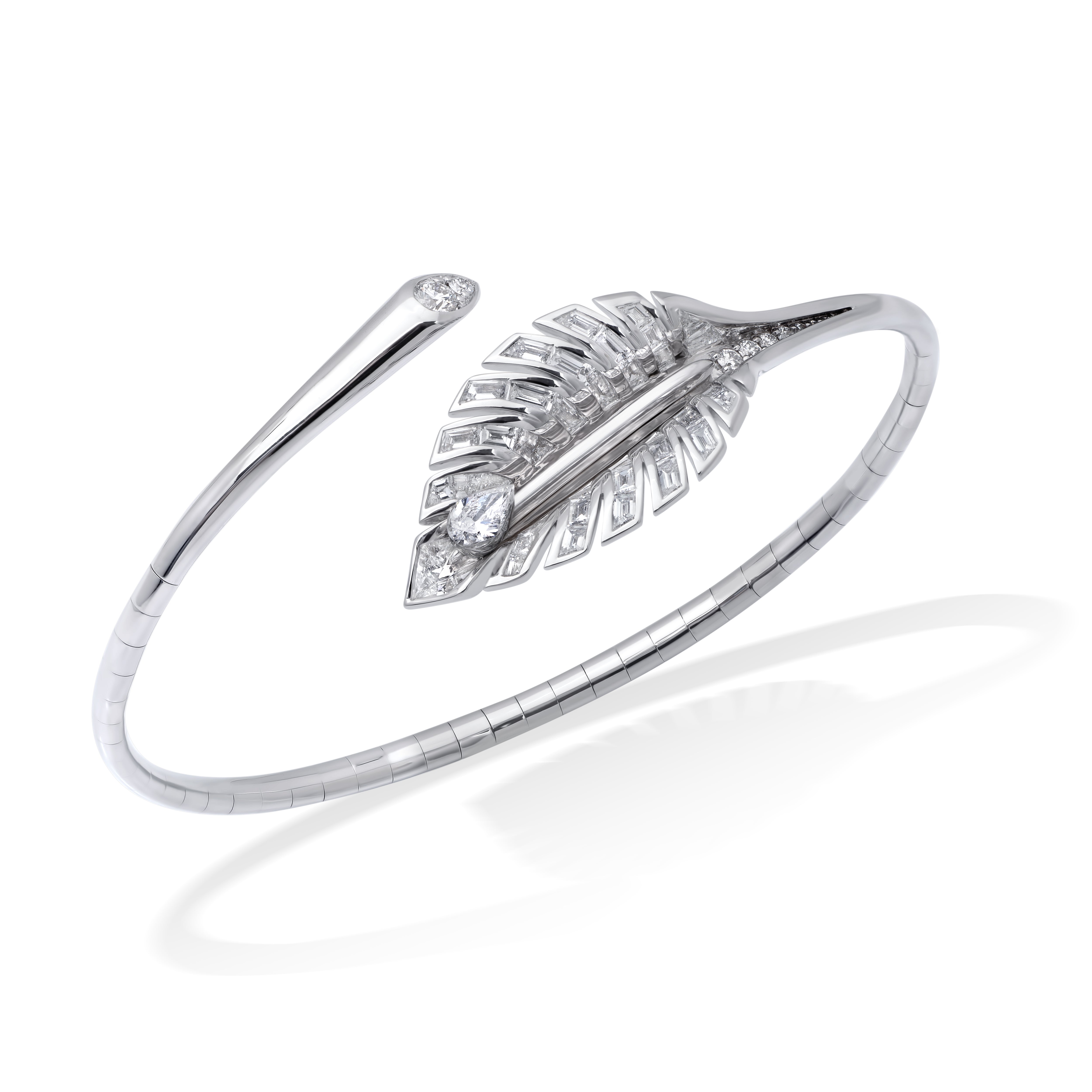 Die spielerische Bewegung des diamantenen Tautropfens verleiht diesem kinetischen Schmuckstück seinen einzigartigen, dynamischen Look. Er wird seine Blicke auf sich ziehen, wenn er sich in Ihrem Rhythmus wiegt. Der unsichtbar gefasste, sich bewegende Diamant reflektiert die Sonne wie ein Tautropfen am frühen Morgen.