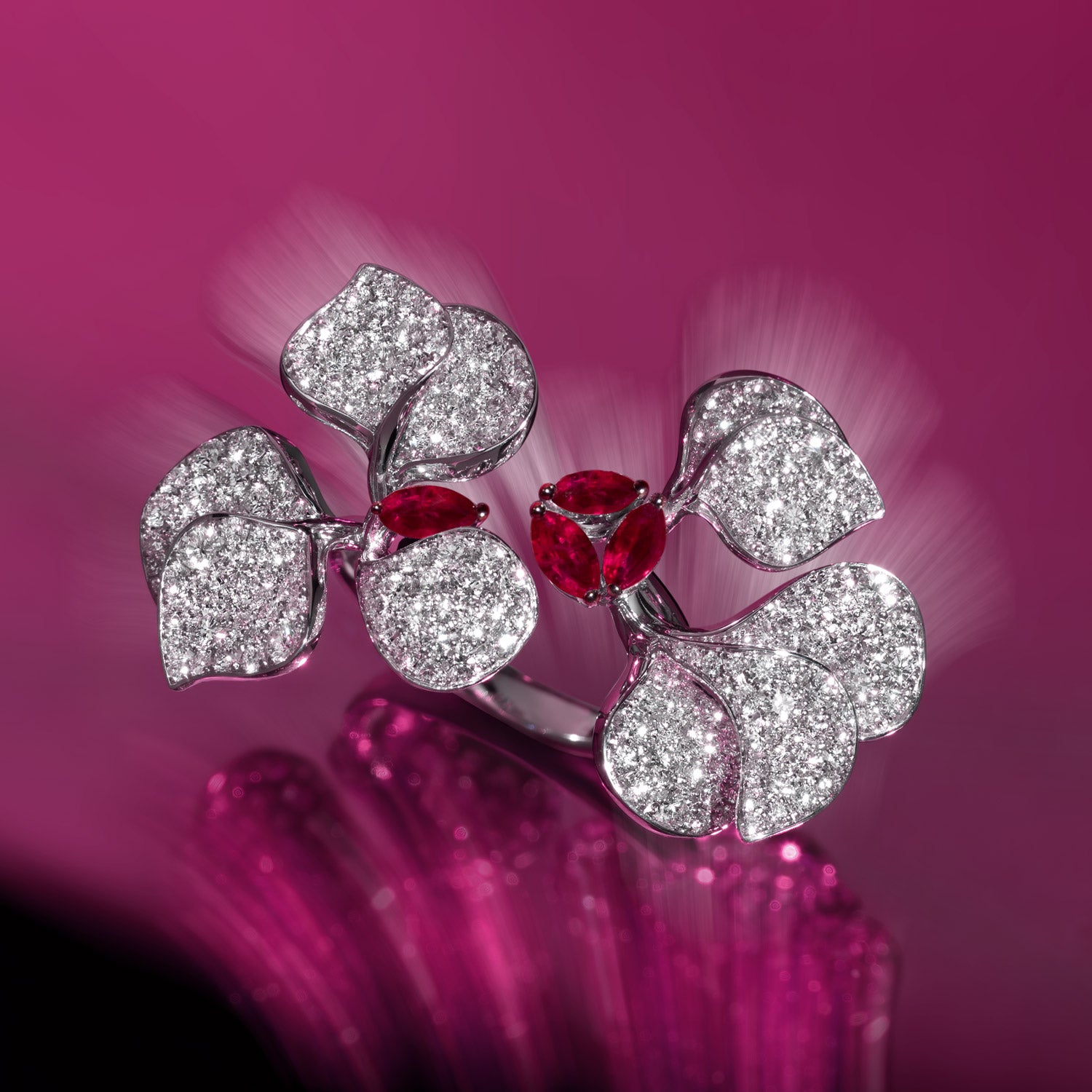 The marquise-cut rubies elegantly portray the captivating essence of blossoming flowers, offering a glimpse into the magnificent array of colours found in full bloom during this magical time. Each ruby holds within it all the passion and vibrancy one could find amidst blooming Parisian gardens.