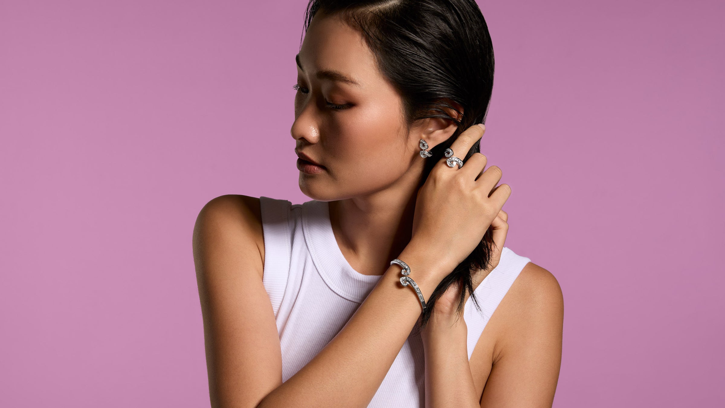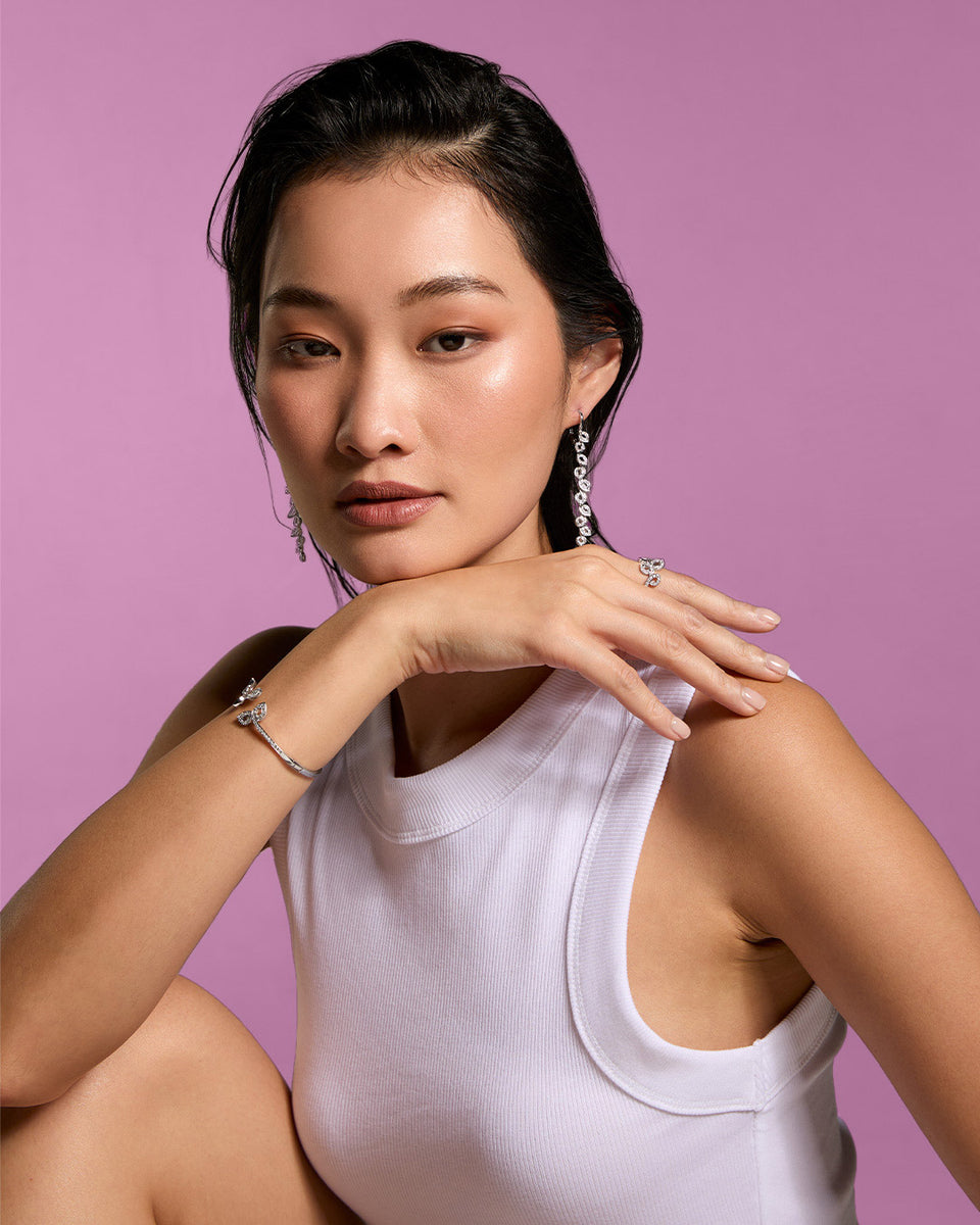 Imagine walking through a serene garden in Paris, where the air is filled with the sweet scent of blossoming flowers which gracefully sway in a warm breeze. Each piece in this enchanting daily line tells a story of delicate blossom buds unfurling into full bloom while maintaining exquisite grace and ethereal lightness. The collection reflects this poetic image with intricate designs adorned with dazzling diamonds shimmering like dewdrops on delicate petals.