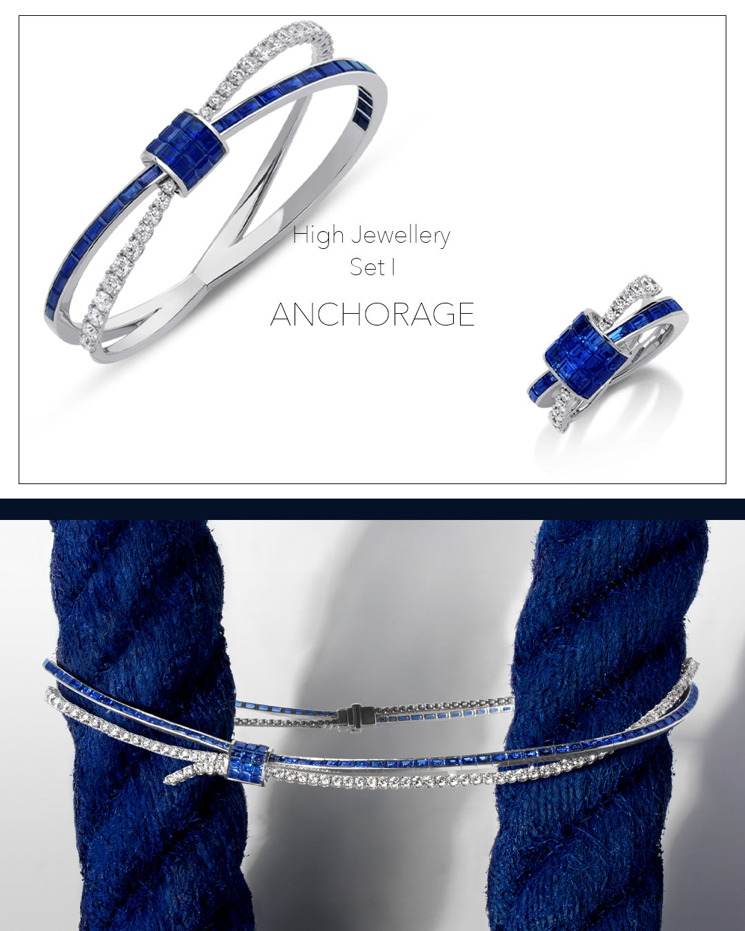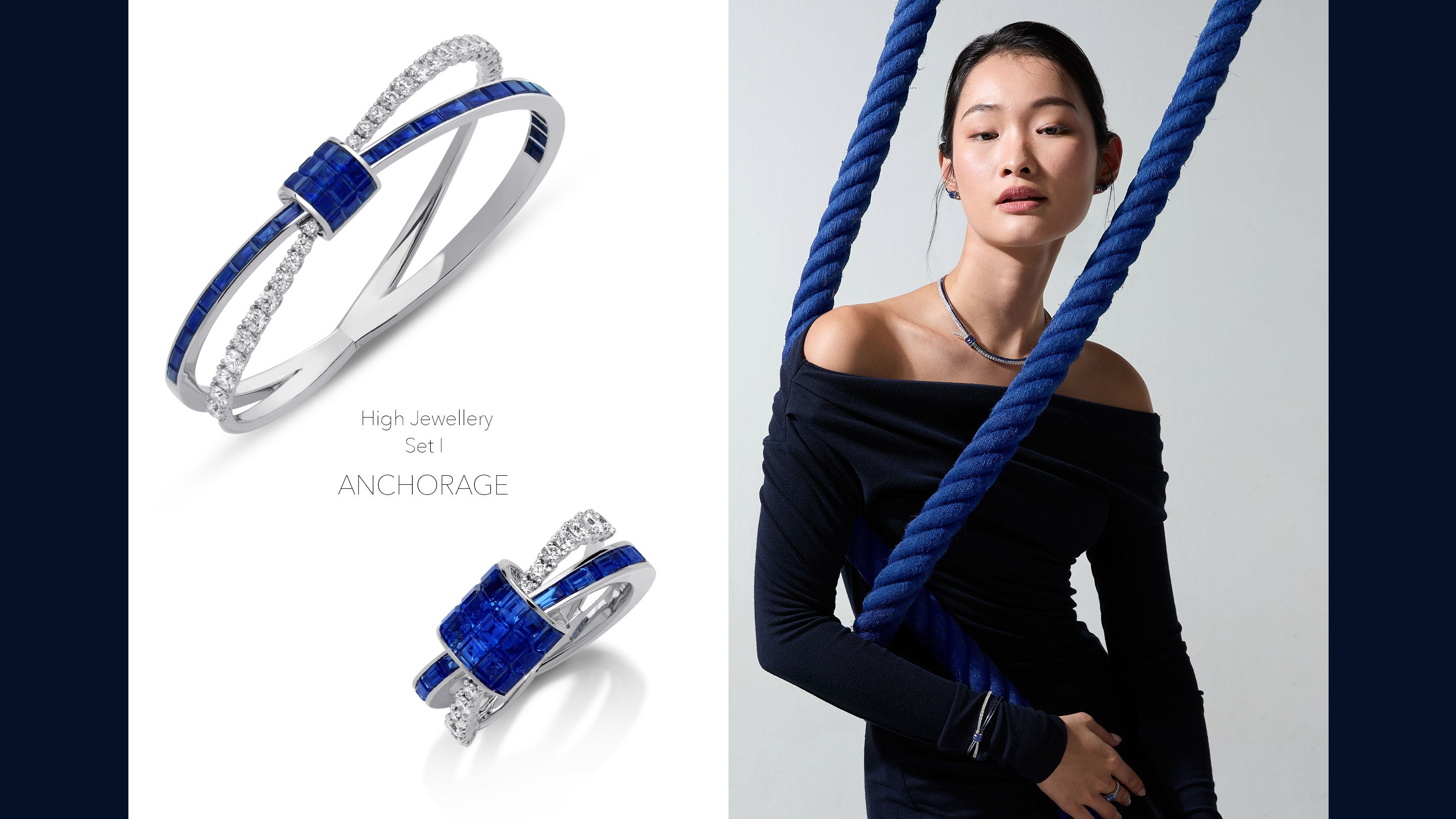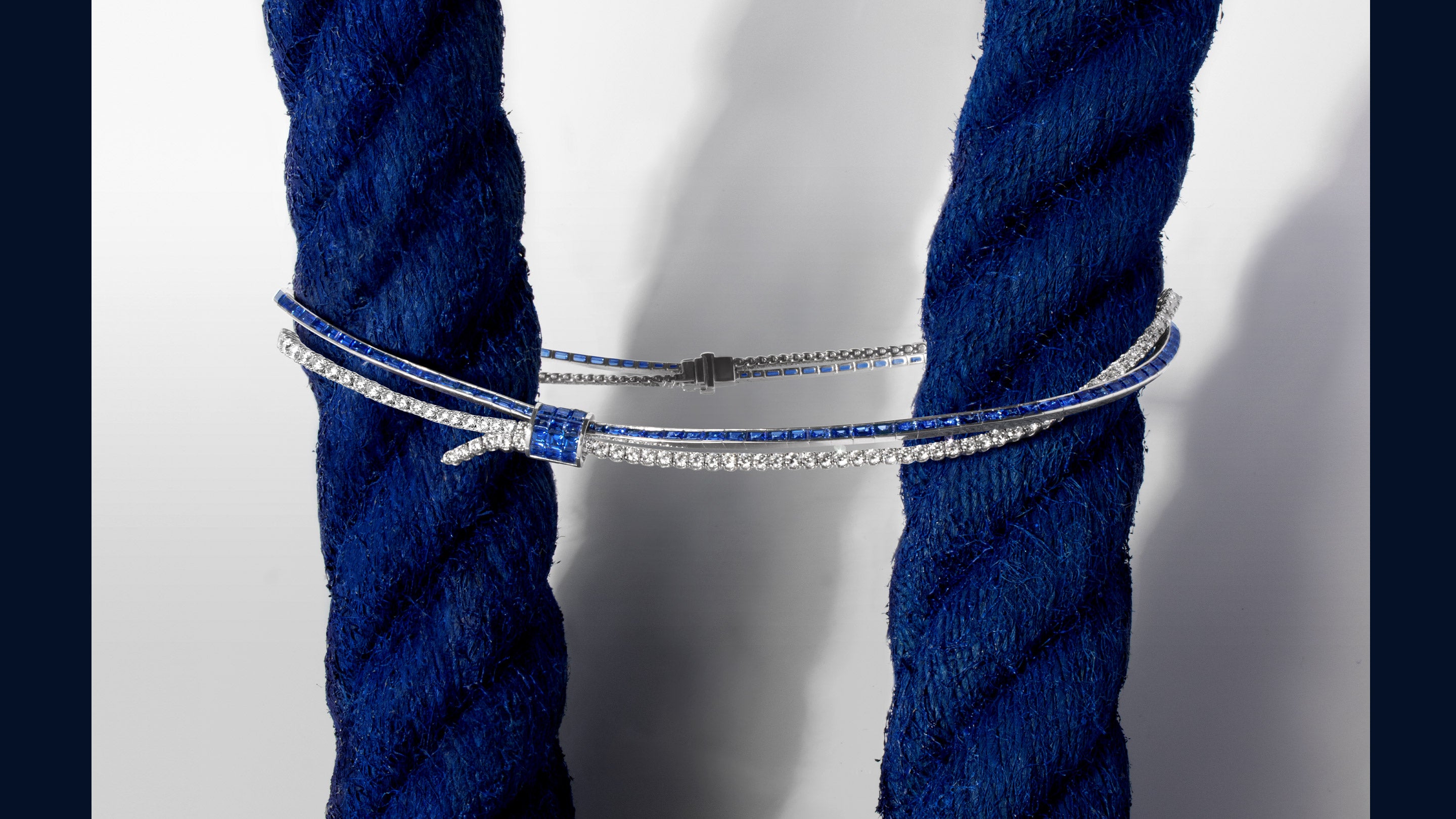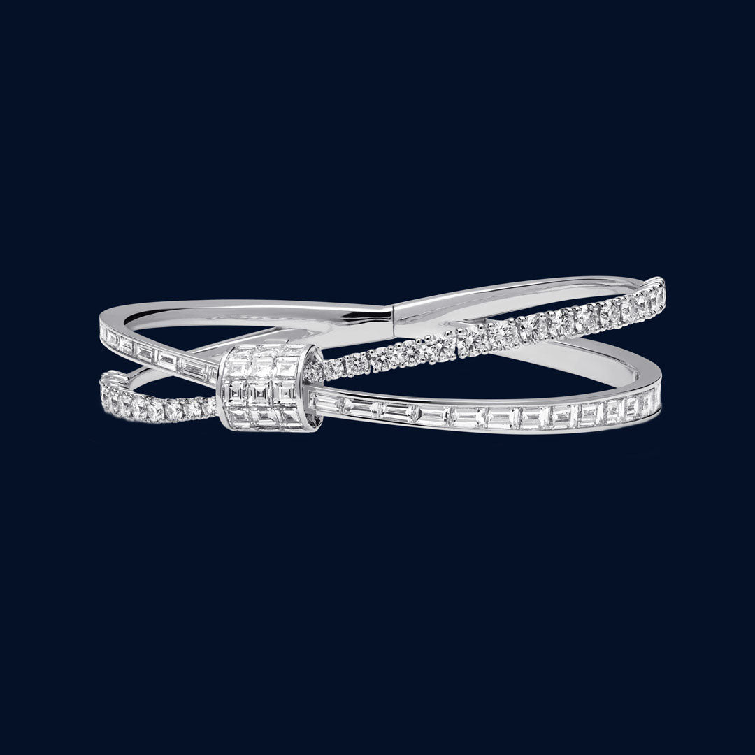 Unlike traditional designs, the knot is deliberately positioned off-centre, introducing a contemporary and unexpected balance. Its interwoven structure mimics the movement of intertwined ropes, fluidly crossing over itself, with varying setting techniques enhancing the contrast between the two strands and their dynamic interplay.