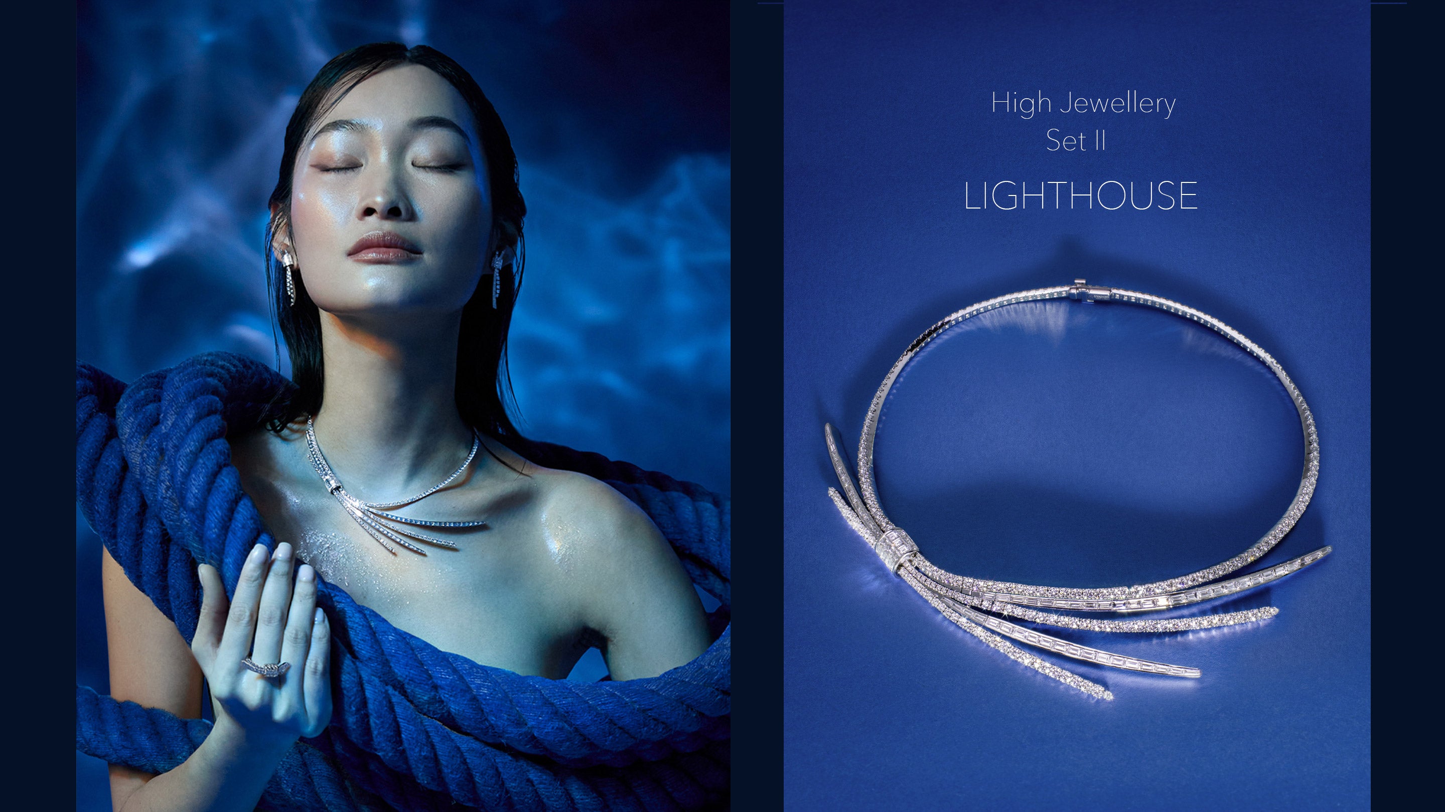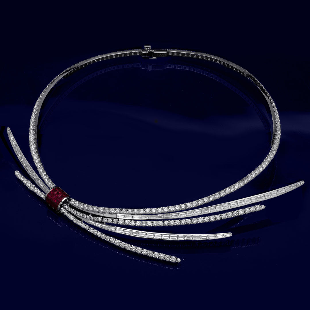 As the masterpiece of HOLD ON TIGHT, this necklace embodies the story's emotional core. At its centre, the knot, crafted with three rows of invisibly set diamonds or rubies, becomes a symbol of resilience and connection. From it, delicate strands unfold like loosened ropes, echoing moments of release, strength, and trust in one's own path. It is a piece that reflects the quiet courage it takes to hold on and let go.
